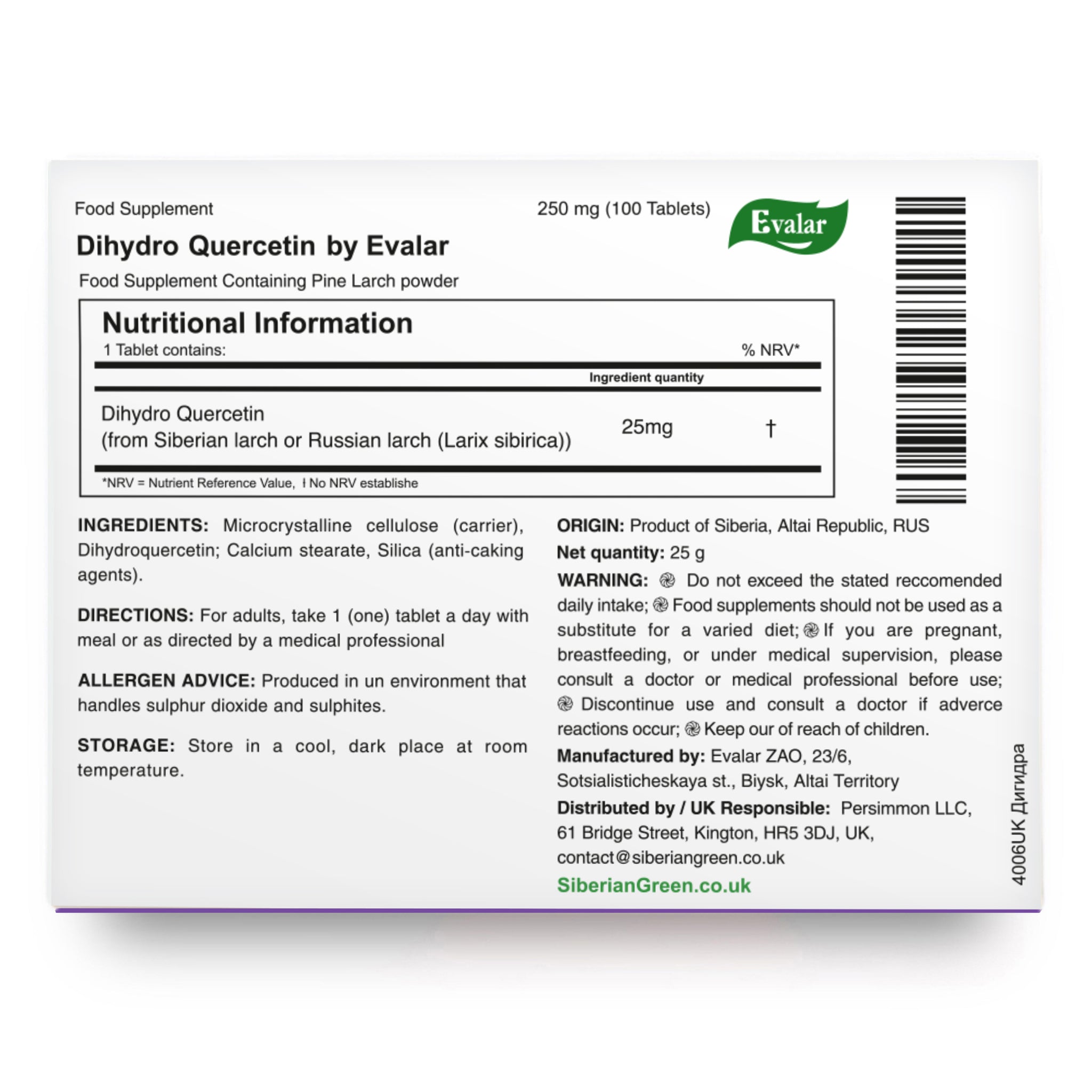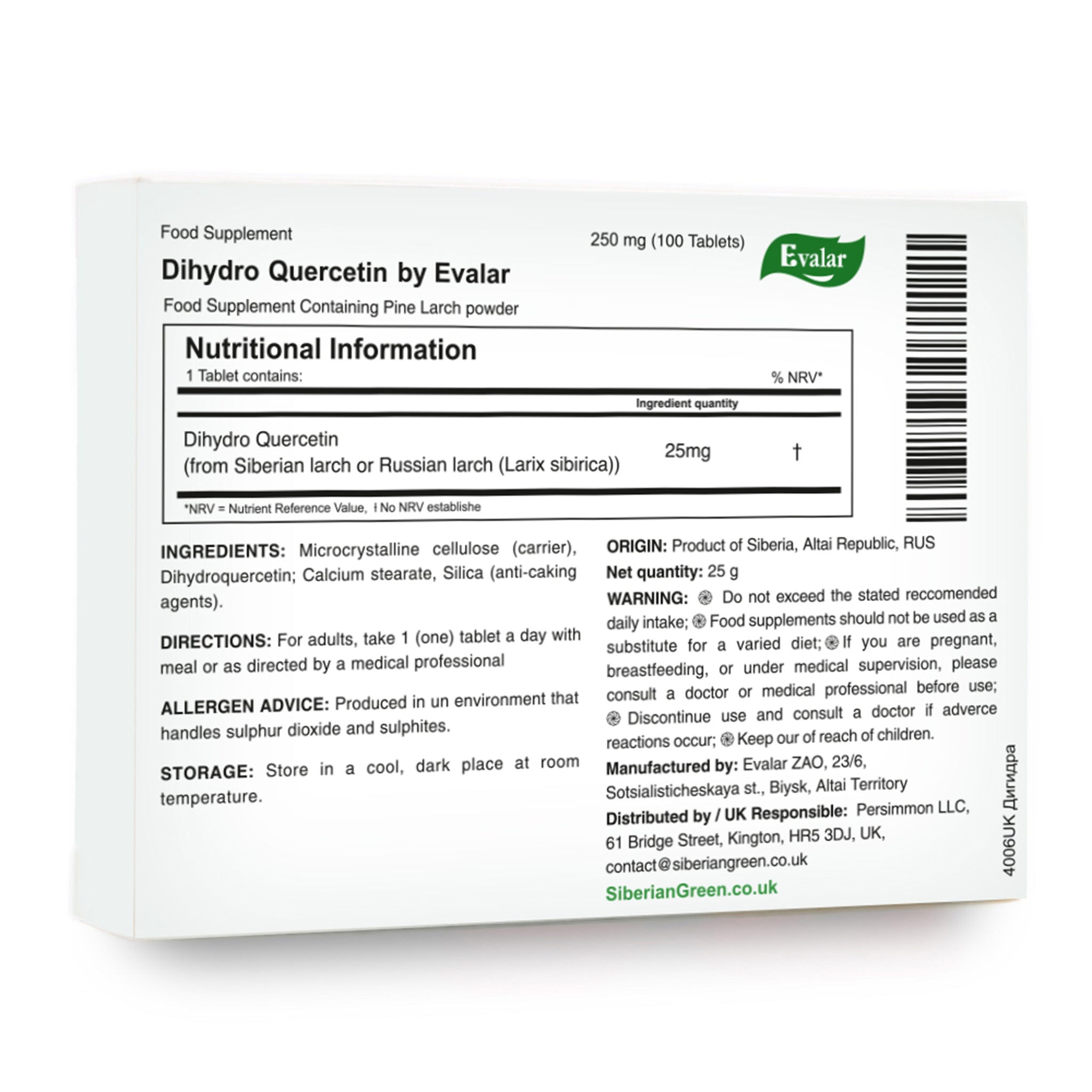 Siberian Pine Larch by Evalar Dihydro Quercetin 100 Tabs